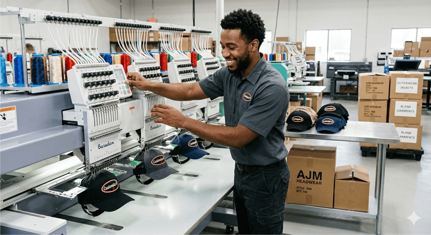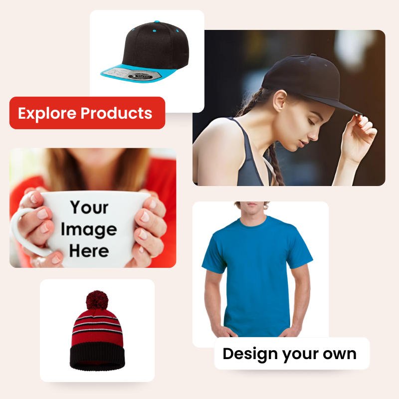 Custom printing & embroidery for apparel, mugs, hats, and more — no minimums, fast turnaround.